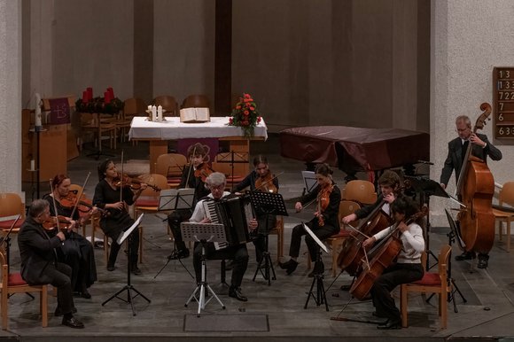 Am Samstag, den 03.12.2022 präsentierte sich das Oberstufenorchester der Musikschule Konstanz Constantia Classica zu seinem Jubiläum vor großem Publikum in der Lutherkirche in absoluter Bestform. Klanglich und technisch auf professionellem Niveau interpretierte das 16-köpfige Streicherensemble unter der Leitung von Sorin Dumitru Musik von Wolfgang Amadeus Mozart und Peter Ilitsch Tschaikowsky. Ein besonderer Höhepunkt waren drei Sätze aus den ‚Five Tango Sensations‘ von Astor Piazzolla mit Dieter Dörrenbächer am Akkordeon als Solisten.